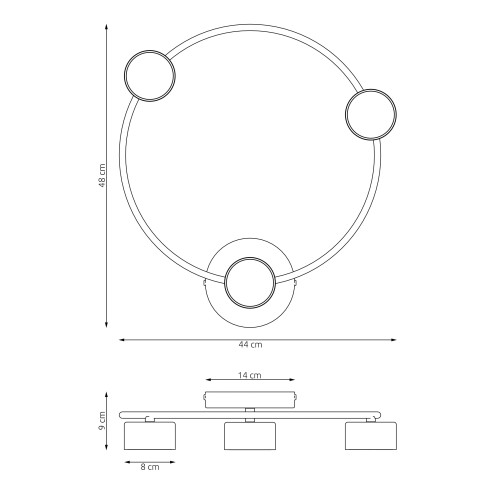 Елегантен плафон с минималистичен дизайн от серията Lucio, изработен от черен цвят кръгла метална основа с метален ринг и три метални глави в черен цвят на цокъл GX53. Функционално решение за осветление на вашия хол, трапезария, спалня, коридор, хотел и заведение.