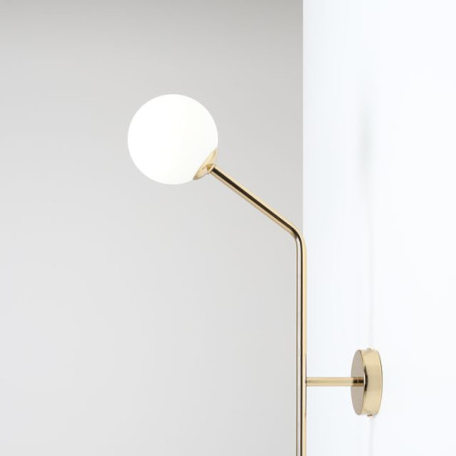 Stylish wall lamp with a minimalist design from the series Pure, made of a gold colour round metal base with a vertical arm and two white matt colour spherical glass shades on an E14 socket. An original proposal for comfortable and modern lighting for your living room, dining room, bedroom, hallway, hotel and restaurant.