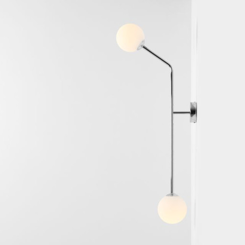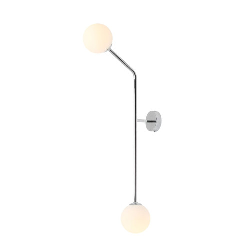 Stylish wall lamp with a minimalist design from the series Pure, made of a chrome colour round metal base with a vertical arm and two white matt colour spherical glass shades on an E14 socket. An original proposal for comfortable and modern lighting for your living room, dining room, bedroom, hallway, hotel and restaurant.
