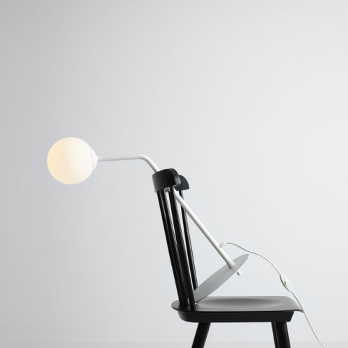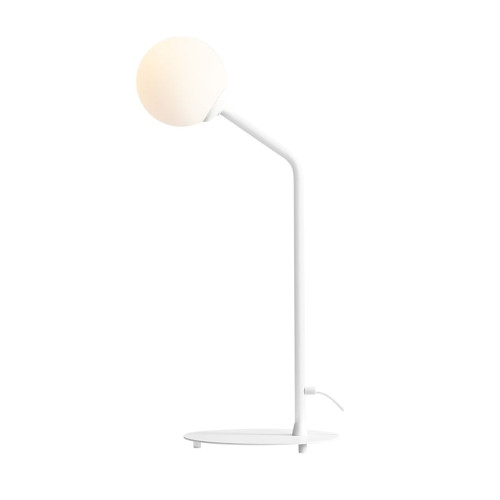 Stylish table lamp with a minimalist design from the series Pure, made of a white matt colour round metal base with arm and white matt colour spherical glass shade on an E14 socket. An original proposal for comfortable and modern lighting for your living room, dining room, bedroom, hotel and restaurant.