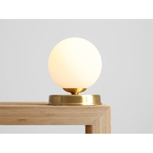 Stylish table lamp from the series Ball, made of a brass colour round metal base and a matt white glass shade in a spherical shape on an E14 socket. Modern proposal for the cozy lighting of your living room, dining room, bedroom, hotel and restaurant.
