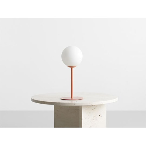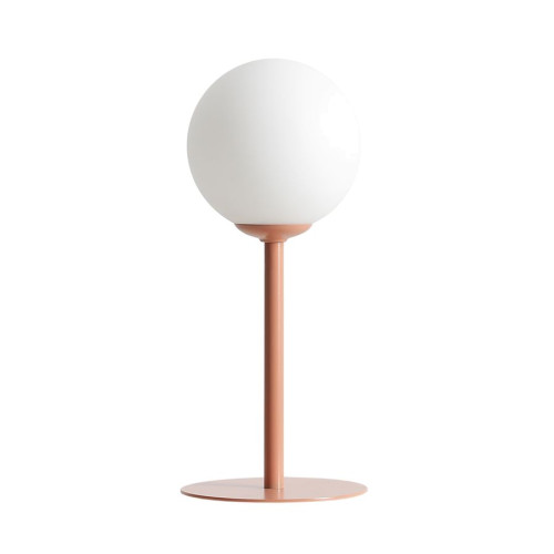 Modern table lamp with a minimalist design from the series Pinne, made of a coral colour round metal base with a long arm and a white spherical glass shade on an E14 socket. An original proposal for comfortable and stylish lighting for your living room, dining room, bedroom, office, hotel and restaurant.