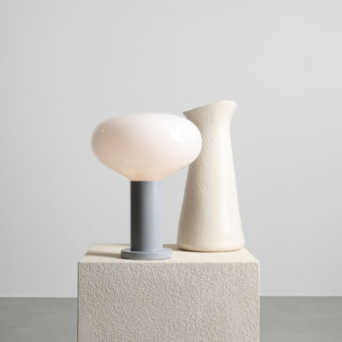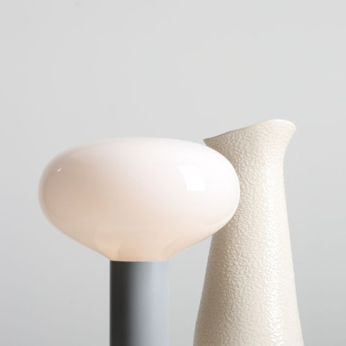Stylish table lamp with a minimalist design from the series Flo, made of a grey colour metal body and opal glass shade on an E14 socket. An original solution for comfortable and modern lighting in your living room, dining room, bedroom, hotel and restaurant.