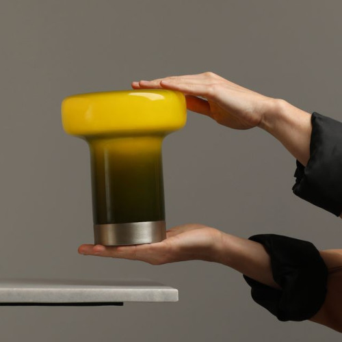 Modern table lamp by designer Mikołaj Nicera from the series Bonbon, made of a nickel colour round metal base and a shade of green opal glass on a E14 socket. Stylish lamp, suitable for the original and comfortable lighting of your living room, dining room, bedroom, hotel and restaurant.