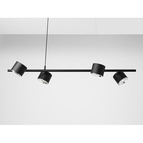 Contemporary pendant lamp with a stylish design from the series Bot, made of a black colour metal base with a hanging arm and four cylindrical shape adjustable metal heads on a GU10 socket. Quality lamp, suitable for the functional lighting of your living room, dining room, bedroom, office, hotel and restaurant.
