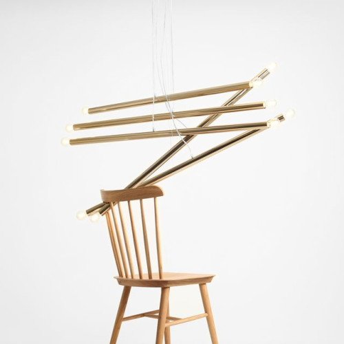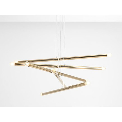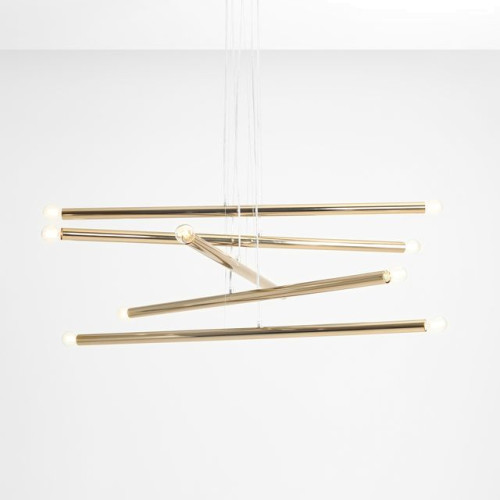 Original pendant lamp with a modern design from the series Tubo, made of a brass colour metal base a..