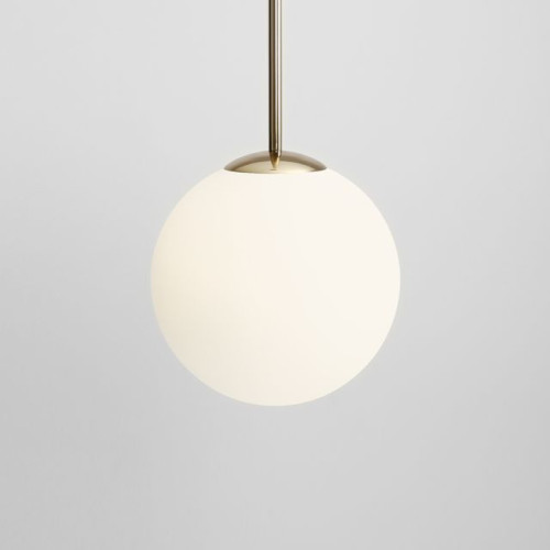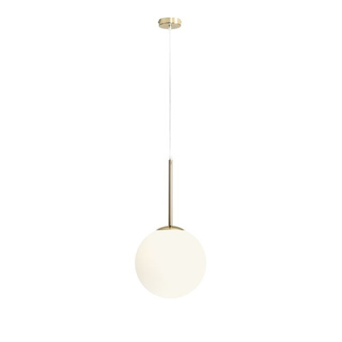 Elegant pendant lamp in a minimalist style from the series Bosso, made of a gold colour metal base and matt white spherical glass shade on an E27 socket. Modern proposal for comfortable lighting of your living room, dining room, bedroom, hotel and restaurant.