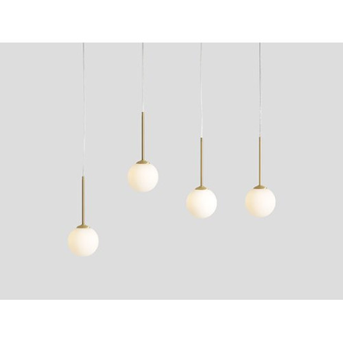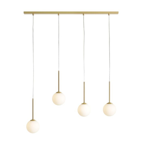 Elegant pendant lamp in a minimalist style from the series Bosso, made of a brass colour rectangular metal base and hanging cylindrical metal elements with four matt white spherical glass shades on an E14 socket. Modern proposal for comfortable lighting of your living room, dining room, hotel and restaurant.
