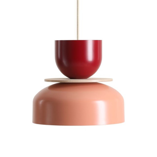 Modern pendant lamp with a stylish design from the series Uto, made of a metal base and a hanging body of two different in shape and size metal shades in red and coral colour, connected by a decorative natural wooden disc on an E27 socket. Attractive hanging lamp, suitable for stylish and original lighting of your living room, dining room, bedroom and restaurant.