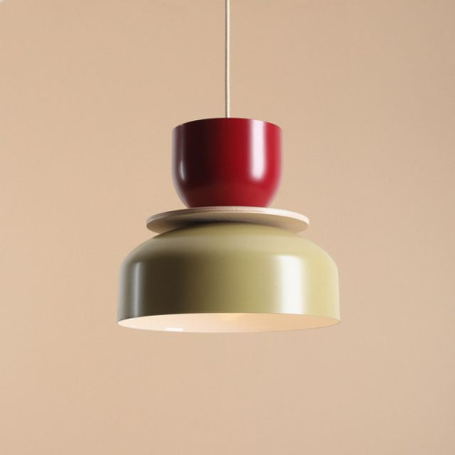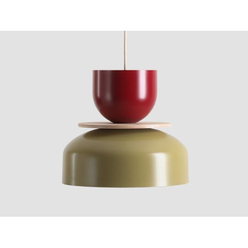 Modern pendant lamp with a stylish design from the series Uto, made of a metal base and a hanging body of two different in shape and size metal shades in red and green colour, connected by a decorative natural wooden disc on an E27 socket. Attractive hanging lamp, suitable for stylish and original lighting of your living room, dining room, bedroom and restaurant.