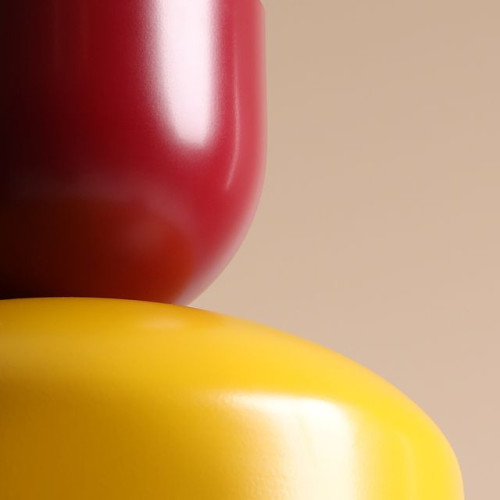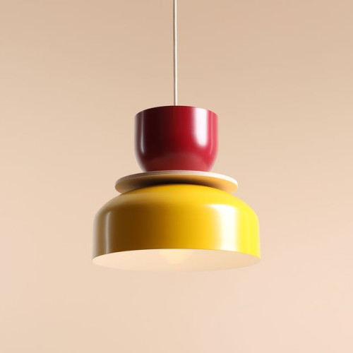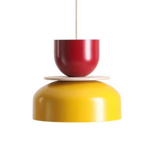 Modern pendant lamp with a stylish design from the series Uto, made of a metal base and a hanging body of two different in shape and size metal shades in red and yellow colour, connected by a decorative natural wooden disc on an E27 socket. Attractive hanging lamp, suitable for stylish and original lighting of your living room, dining room, bedroom and restaurant.