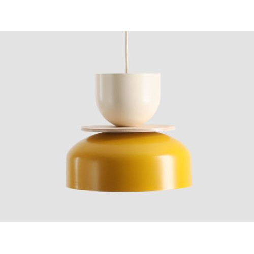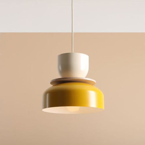 Modern pendant lamp with a stylish design from the series Uto, made of a metal base and a hanging body of two different in shape and size metal shades in cream and yellow colour, connected by a decorative natural wooden disc on an E27 socket. Attractive hanging lamp, suitable for stylish and original lighting of your living room, dining room, bedroom and restaurant.