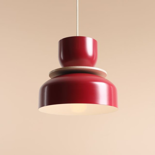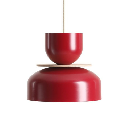 Modern pendant lamp with a stylish design from the series Uto, made of a metal base and a hanging body of two different in shape and size metal shades in red colour, connected by a decorative natural wooden disc on an E27 socket. Attractive hanging lamp, suitable for stylish and original lighting of your living room, dining room, bedroom and restaurant.