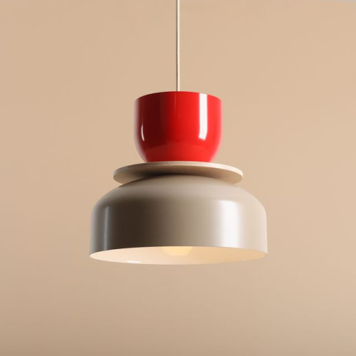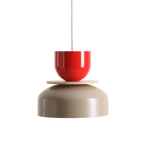 Modern pendant lamp with a stylish design from the series Uto, made of a metal base and a hanging body of two different in shape and size metal shades in red and beige colour, connected by a decorative natural wooden disc on an E27 socket. Attractive hanging lamp, suitable for stylish and original lighting of your living room, dining room, bedroom and restaurant.