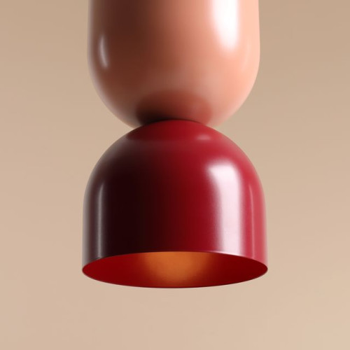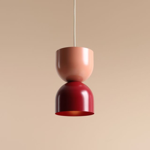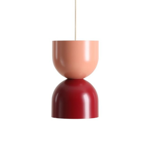 Stylish pendant lamp with an original design from the series Lui, made of a metal base and a hanging body, consisting of two identically sized metal shades in coral and red colour, which can be installed in a different configuration on an E27 socket. Modern lamp, suitable for stylish and comfortable lighting of your living room, dining room, bedroom and restaurant.