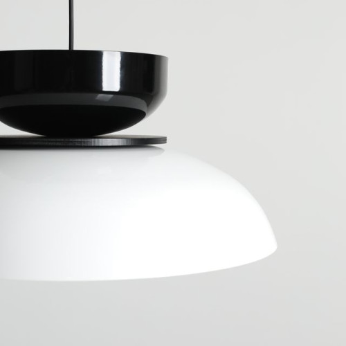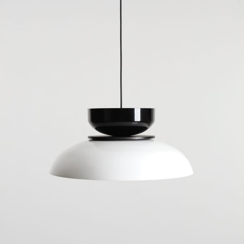 Original pendant lamp with an attractive design from the series Aldo, made of a metal base and two metal shades in black and white colour, connected by a wooden disc. Modern solution for the interior lighting of your living room, dining room, bedroom, hotel and restaurant.