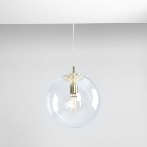 Stylish pendant lamp with a modern design from the series Globe, made of a gold colour metal base and a spherical shape transparent glass diffuser on an E27 socket. Quality hanging lamp, suitable for comfortable and stylish lighting of your living room, dining room, bedroom, hotel and restaurant.
