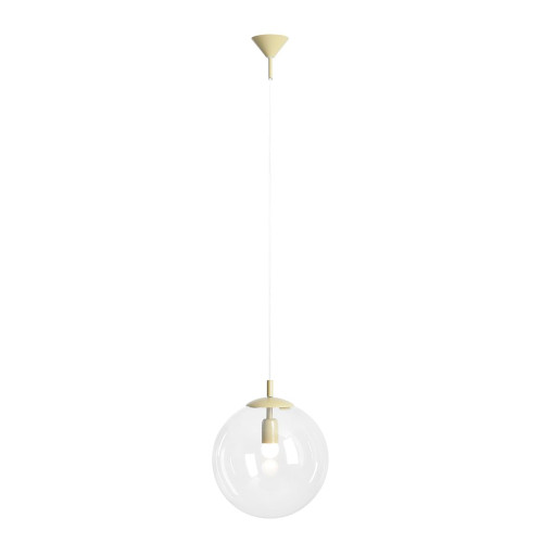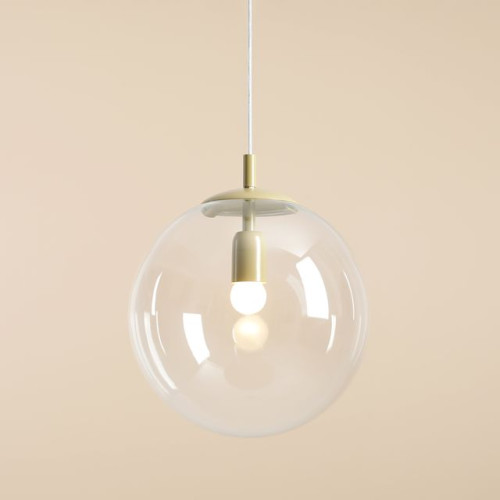 Stylish pendant lamp with a modern design from the series Globe, made of a pistachio colour metal base and a spherical shape transparent glass diffuser on an E27 socket. Quality hanging lamp, suitable for comfortable and stylish lighting of your living room, dining room, bedroom, hotel and restaurant.
