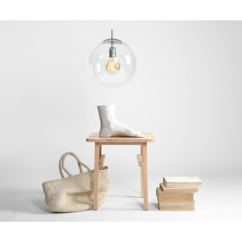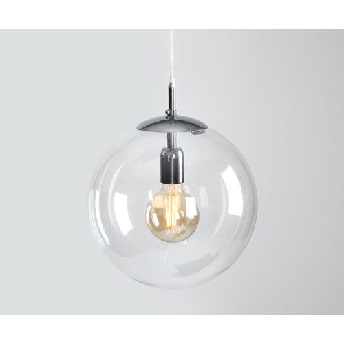 Stylish pendant lamp with a modern design from the series Globe, made of a chrome colour metal base and a spherical shape transparent glass diffuser on an E27 socket. Quality hanging lamp, suitable for comfortable and stylish lighting of your living room, dining room, bedroom, hotel and restaurant.