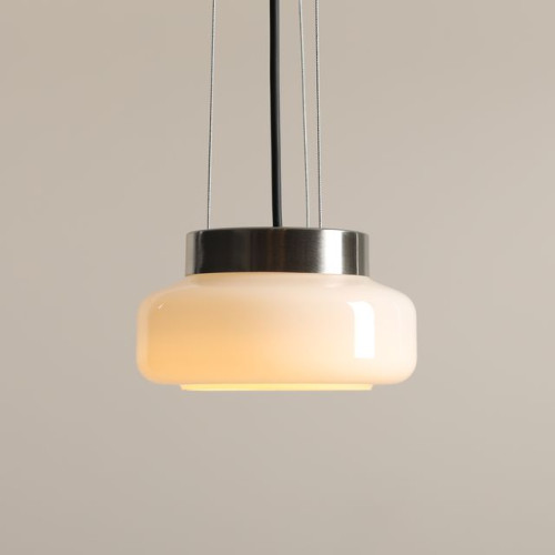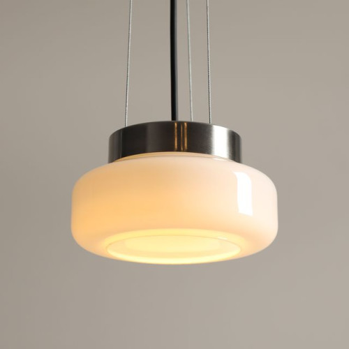 Modern pendant lamp by designer Mikołaj Nicera from the series Bonbon, made of a nickel colour metal base and a shade of white opal glass on a GX53 socket. Stylish lamp, suitable for the original and comfortable lighting of your living room, dining room, bedroom, hotel and restaurant.