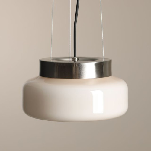 Modern pendant lamp by designer Mikołaj Nicera from the series Bonbon, made of a nickel colour metal base and a shade of cream opal glass on a GX53 socket. Stylish lamp, suitable for the original and comfortable lighting of your living room, dining room, bedroom, hotel and restaurant.