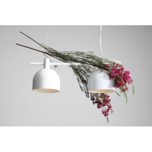 Stylish pendant lamp with a modern design from the series Beryl, made of a matt white colour metal base and a hanging arm with two metal shades in matt white colour of an E27 socket. An original hanging lamp, suitable for comfortable lighting in your living room, dining room, bedroom, hotel and restaurant.