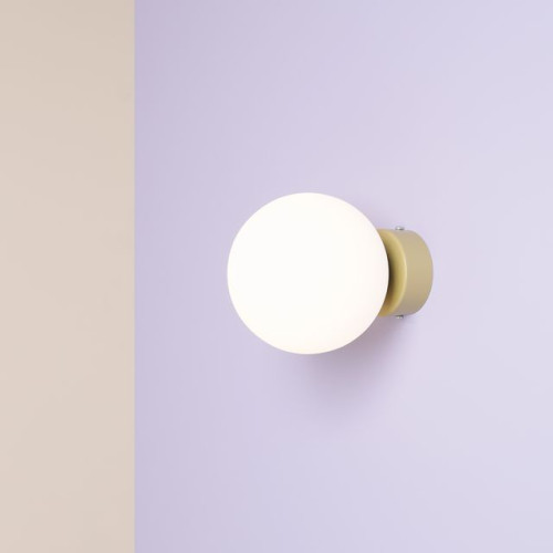 Stylish wall lamp from the series Ball, made of a pistachio colour round metal base and a matt white glass shade in a spherical shape on an E14 socket. Modern proposal for the cozy lighting of your living room, dining room, bedroom, hallway, hotel and restaurant.