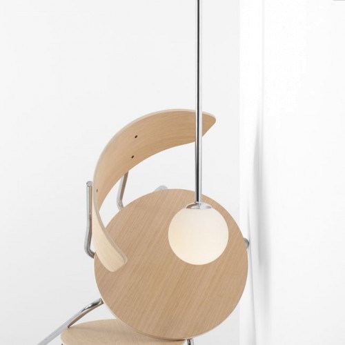 Modern wall lamp with a minimalist design from the series Pinne, made of a chrome colour metal base with an arm and a white spherical glass shade on an E14 socket. An original proposal for comfortable and stylish lighting for your living room, dining room, bedroom, office, hotel and restaurant.