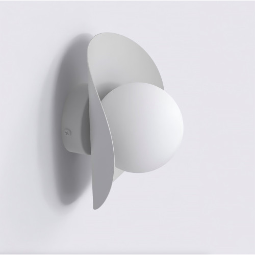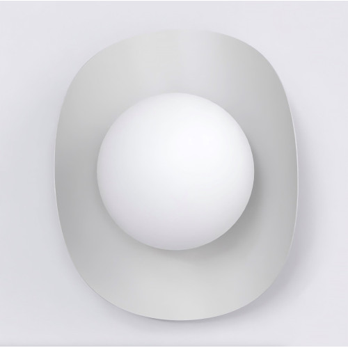 Modern wall lamp in minimalist style from the series Fiero, made of grey colour round metal base and curved metal shade with opal glass diffuser in spherical shape. Original designer lamp, suitable for interior lighting of your living room, bedroom, hallway, office, hotel and restaurant.
