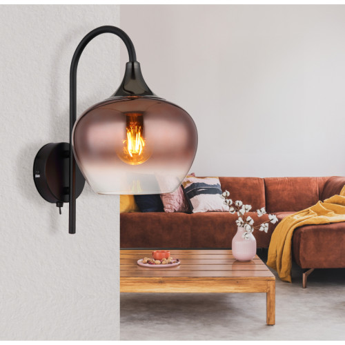 Elegant wall lamp with a modern design from the series Maxy, made of a black colour metal base with a built-in switch: ON/OFF and dome-shaped glass shade in a copper colour that fades to transparent. An original solution for interior lighting in your living room, dining room, bedroom, hotel and restaurant.
