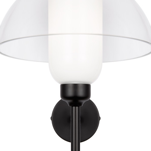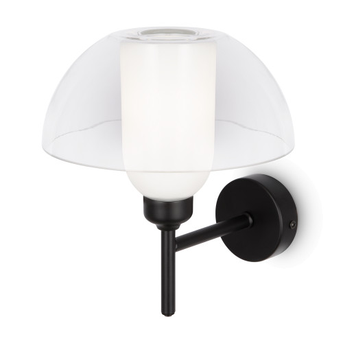 Stylish wall lamp from the series Memory, made of a black colour metal base with arm and a white glass diffuser, covered with a transparent dome-shaped glass shade. Modern solution for interior lighting in your living room, dining room, bedroom, hotel and restaurant.