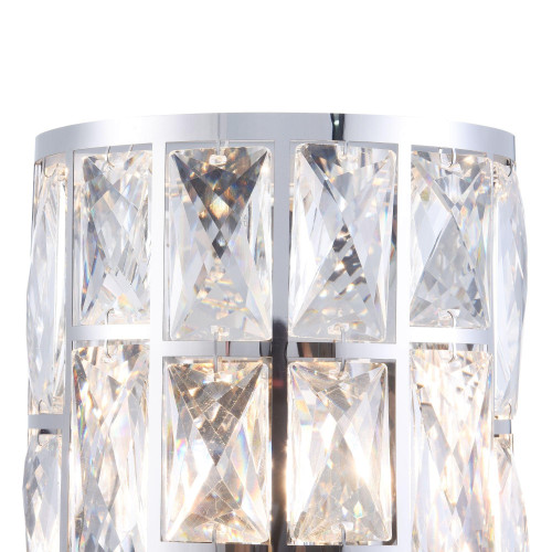Stylish wall lamp with original design made of chromed metal frame with diffuser of transparent crystal plates attached to each other. An impressive lamp that will give elegance and pleasant light to your living room, dining room, bedroom, corridor, hotel or restaurant.