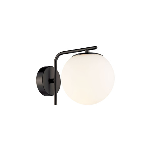 Stylish wall lamp with a sophisticated design from the series Nefeli, made of a black colour round metal base with arm and opal white glass shade in a spherical shape. Great offer for comfortable and modern lighting in your living room, dining room, bedroom, hotel and restaurant.