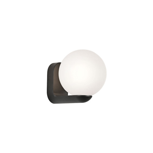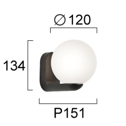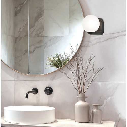 Stylish wall lamp with a high degree of ingress protection: IP44 from the series Victoria, made of a black colour metal base and arm with opal glass shade in spherical shape. Modern proposal for quality and cozy lighting of your bathroom and wet room.