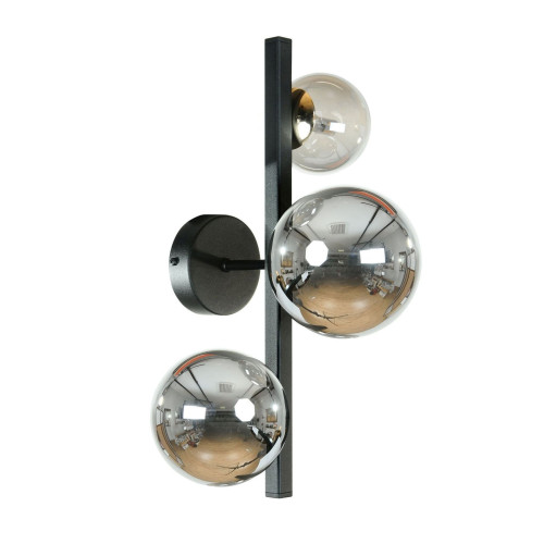 Stylish wall lamp from the series Serenity, made of a black colour metal base with an arm and three spherical glass shades in a smoked grey colour with gold metal details. The quality choice for the lighting of your living room, dining room, bedroom, hotel or restaurant.