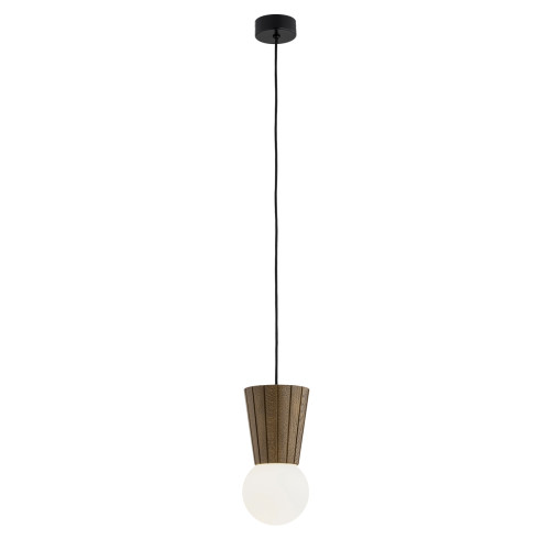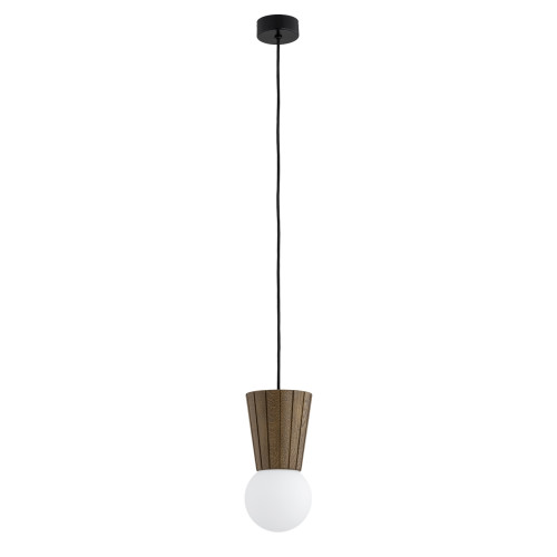 Original pendant lamp with a modern design from the series Volante, made of a black colour metal base and hanging ribbed wooden shade with opal matt spherical glass diffuser. Stylish lamp, suitable for comfortable lighting in your living room, dining room, bedroom, hotel and restaurant.