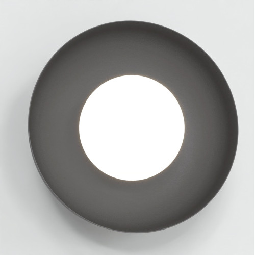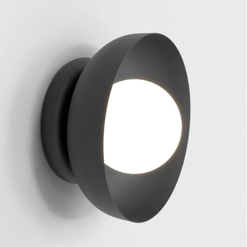Modern wall lamp in a minimalist style from the series Ozzy, made of a black colour round metal base and a dome-shaped metal shade in black colour with an opal glass diffuser in a spherical shape. Quality lamp, suitable for original lighting in your living room, dining room, bedroom, hallway, hotel or restaurant.