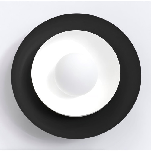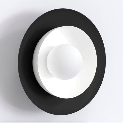 Original wall lamp with a modern design from the series Poppi, made of a round metal base and a double dome-shaped metal shade in black and white colour with an opal glass diffuser in a spherical shape. Stylish lamp suitable for original lighting in your living room, dining room, bedroom, hallway, hotel or restaurant.