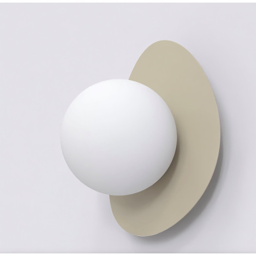 Original wall lamp with a stylish design from the series Ovo, made of a beige colour round metal base and an asymmetrical metal body with an opal glass shade. Modern designer lamp, suitable for the interior lighting of your living room, bedroom, hallway, office, hotel and restaurant.