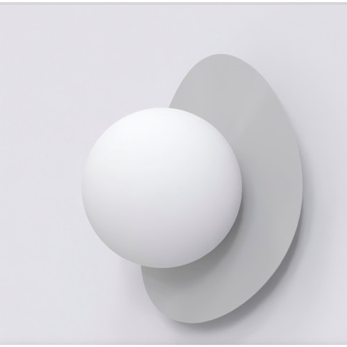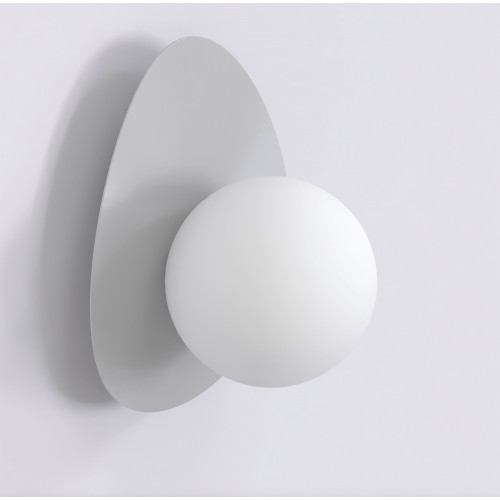 Original wall lamp with a stylish design from the series Ovo, made of a grey colour round metal base and an asymmetrical metal body with an opal glass shade. Modern designer lamp, suitable for the interior lighting of your living room, bedroom, hallway, office, hotel and restaurant.