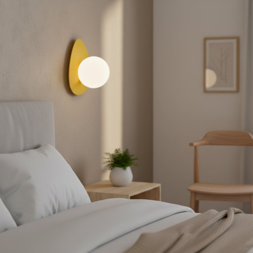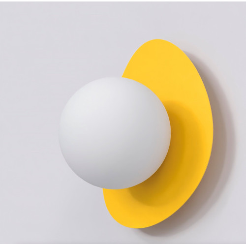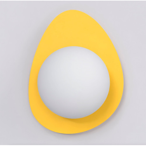 Original wall lamp with a stylish design from the series Ovo, made of an orange colour round metal base and an asymmetrical metal body with an opal glass shade. Modern designer lamp, suitable for the interior lighting of your living room, bedroom, hallway, office, hotel and restaurant.
