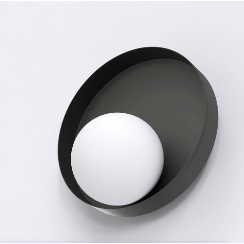 Original wall lamp in minimalist style from the series Kido, made of black colour metal base and cylindrical metal body with opal glass shade. Stylish designer lamp, suitable for interior lighting of your living room, bedroom, hallway, office, hotel and restaurant.