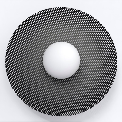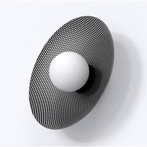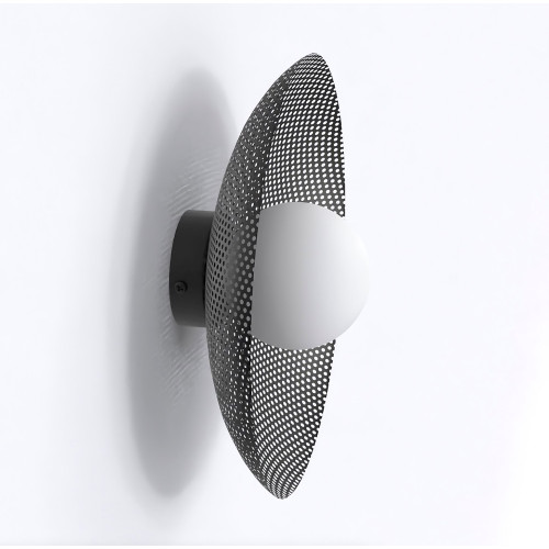 Original wall lamp in a modern style from the series Vibez, made of a black colour round metal base and a perforated metal shade with an opal glass diffuser in a spherical shape. Quality lamp, suitable for the original lighting in your living room, dining room, bedroom, hallway, hotel or restaurant.