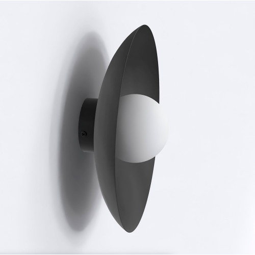 Original wall lamp in a modern style from the series Inspo, made of a black colour round metal base and a black metal shade with an opal glass diffuser in a spherical shape. Quality lamp, suitable for the original lighting in your living room, dining room, bedroom, hallway, hotel or restaurant.