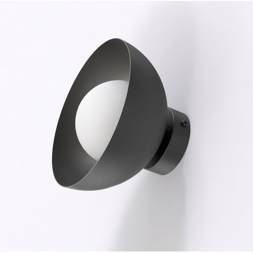 Modern wall lamp in minimalist style from the series Bibi, made of black colour round metal base and hemispherical metal shade with opal glass diffuser in spherical shape. Original designer lamp, suitable for interior lighting of your living room, bedroom, hallway, office, hotel and restaurant.