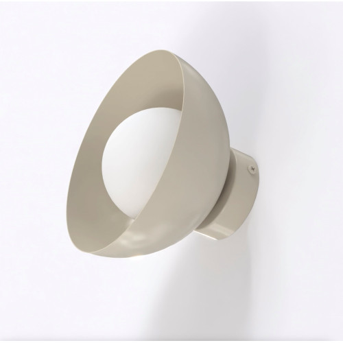 Modern wall lamp in minimalist style from the series Bibi, made of beige colour round metal base and hemispherical metal shade with opal glass diffuser in spherical shape. Original designer lamp, suitable for interior lighting of your living room, bedroom, hallway, office, hotel and restaurant.