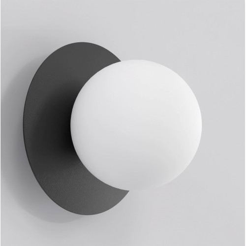 Elegant wall lamp with a geometric design from the series Americana, made of a black colour round flat metal body with an opal glass shade in a spherical shape. Modern addition to the cozy lighting of your living room, bedroom, hallway, office, hotel and restaurant.