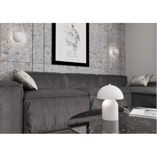 Modern table lamp with a stylish design from the series Mush, made of a white colour metal base and a dome-shaped metal shade on a G9 socket. A lamp that combines retro style with modern minimalism, suitable for the interior lighting of your living room, dining room, bedroom, office, hotel or restaurant.