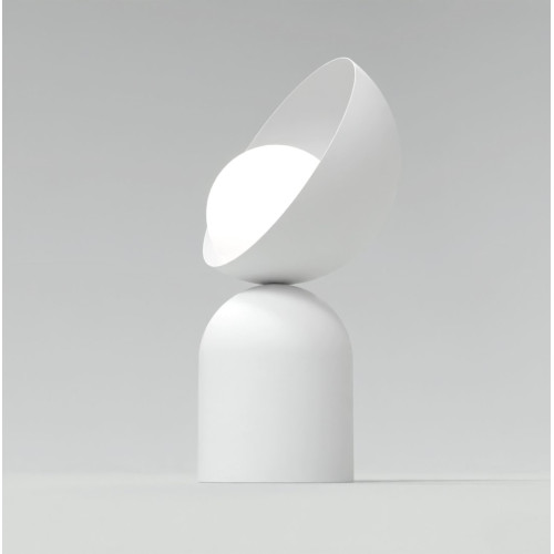 Modern table lamp with a stylish design from the series Boto, made of a white colour metal base and a hemispherical metal shade with an opal glass diffuser in a spherical shape. An original addition to the interior lighting of your living room, dining room, bedroom, hotel and restaurant.