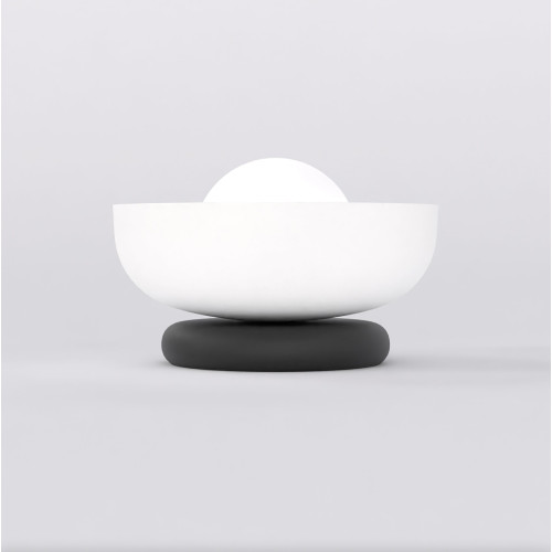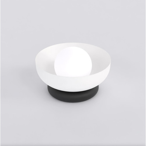 Modern table lamp in a minimalist style from the series Ozzy, made of a black colour round metal base and a dome-shaped metal shade in white colour with an opal glass diffuser in a spherical shape. Quality lamp, suitable for original lighting in your living room, dining room, bedroom, hotel or restaurant.